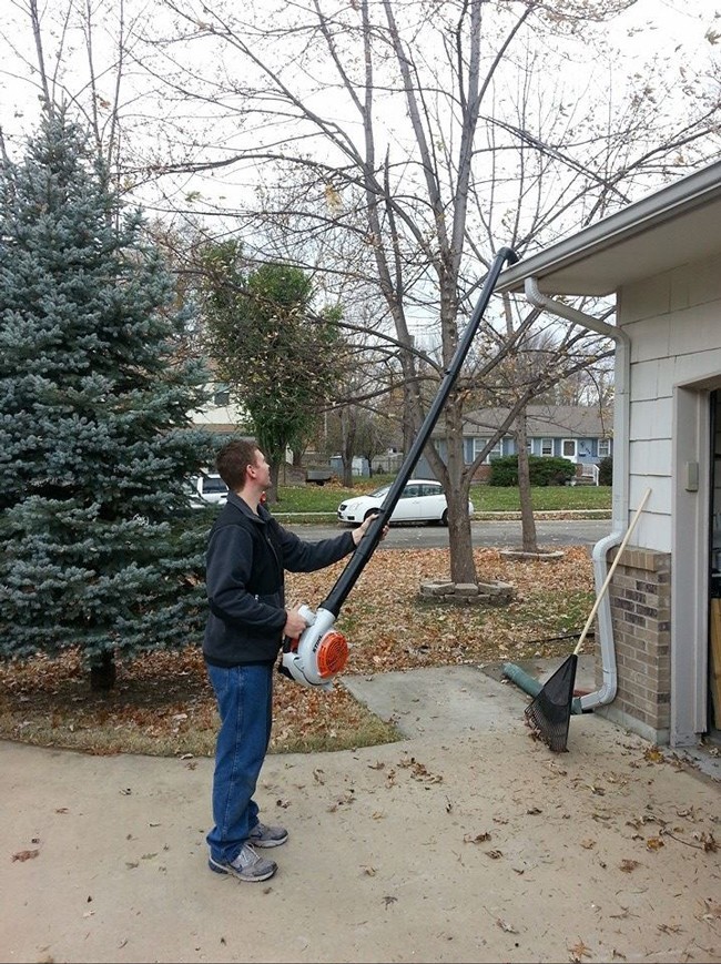 Utiliser une souffleuse à feuilles et un tube en PVC pour nettoyer les gouttières sans échelle.