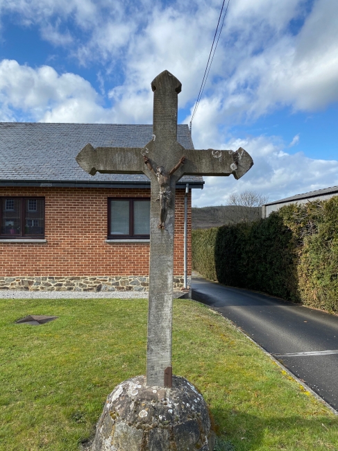 Croix en pierre, érigée après récupération effectuée parmi les tombes du vieux cimetière. Elle fut placée en 1945 ( en remplacement d'une croix en bois au pied pourri) le long de la route de Saint-Hubert