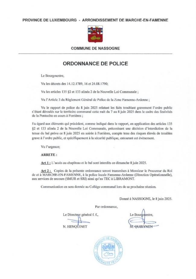 C'est en fait regrettable cette situation qui ne reflète pas la philosophie des éléments festifs sur le territoire de Nassogne . Dans toutes les actions festives , il n'y a pas de débordements qui font preuve d'agressivité gratuite. Je pense que la jeunesse du grand Nassogne à droit à une image qui reflète ses vrais valeurs et qui est représentative des valeurs qu'ils ont crée. Il est particulièrement délicat d'agir dans de tels cas de figure et le bon sens guide les décisions. C'est un échec pour les organisateurs et les bénévoles qui avaient œuvré pour la réussite de cet évènement . Espérons que la réflexion sera positive et permettra qu'en 2026 cette action festive se déroule sans soucis