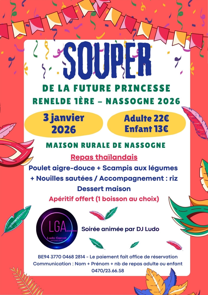 La future princesse canaval 2026 Renelde Iʳᵉ convie la population à un souper thaïlandais placé sous le signe de la convivialité et de la fête. L’événement aura lieu le samedi 3 janvier 2026 à la Maison rurale de Nassogne.