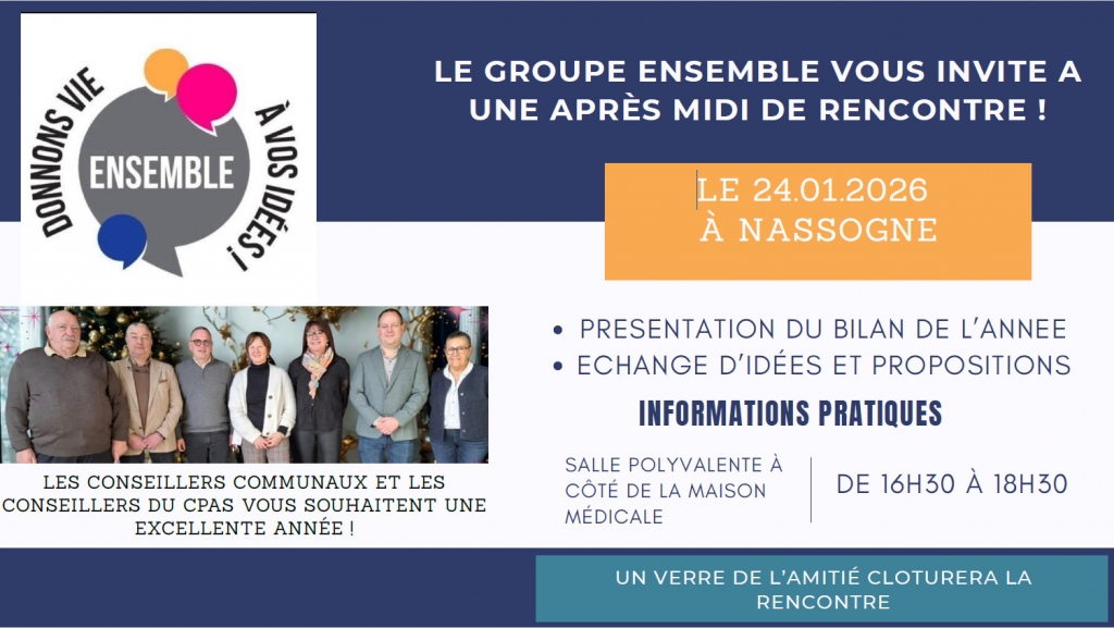 samedi 17 janvier 2026 Rencontre citoyenne à Nassogne : le groupe “Ensemble” vous donne rendez-vous le 24 janvier Share Tweet Lien permanent Catégories : Divers 0 commentaire