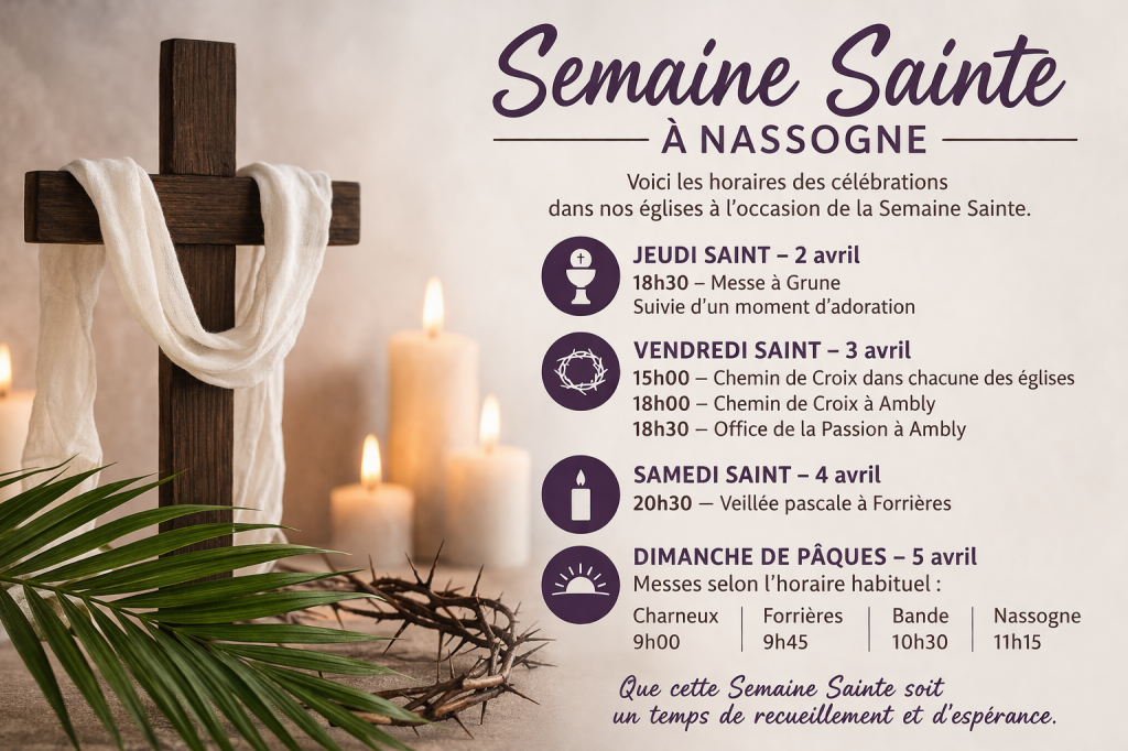 À l’approche de Pâques, plusieurs habitants nous ont demandé les horaires des célébrations de la Semaine Sainte dans l’entité de Nassogne. Voici les informations communiquées afin de permettre à chacun de s’organiser.