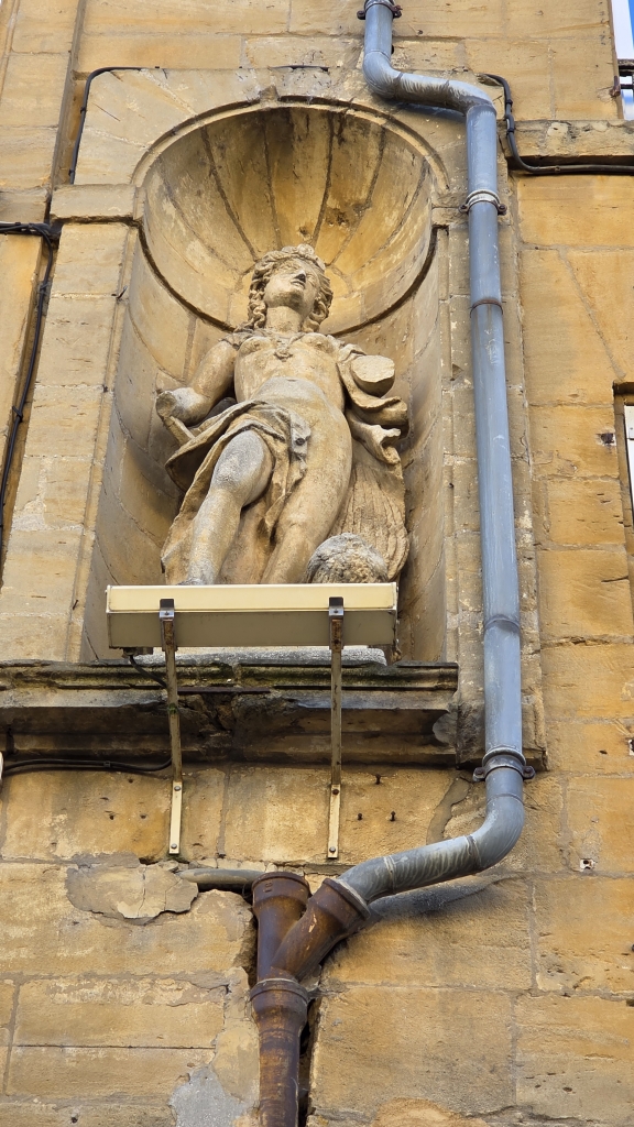 Mais le guide nous invite à lever les yeux au-dessus des vitrines modernes pour découvrir un trésor discret : quatre statues de pierre logées dans des niches sur les façades des maisons, chacune représentant une divinité grecque ou romaine. Ces quatre statues, avec leurs niches, sont classées monuments historiques depuis le 30 avril 1936.