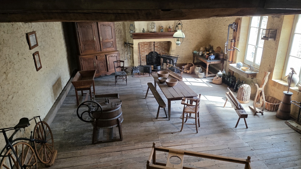 La seconde pièce reconstitue la cuisine-salle commune, véritable cœur de la maison paysanne : une grande cheminée en briques avec sa cuisinière en fonte, une longue table de ferme avec ses bancs, une baratte à beurre, des paniers d'osier, des cruches en grès, et même un vélo ancien appuyé contre le mur. Tout ici respire l'authenticité et la vie simple mais laborieuse des familles ardennaises d'autrefois.